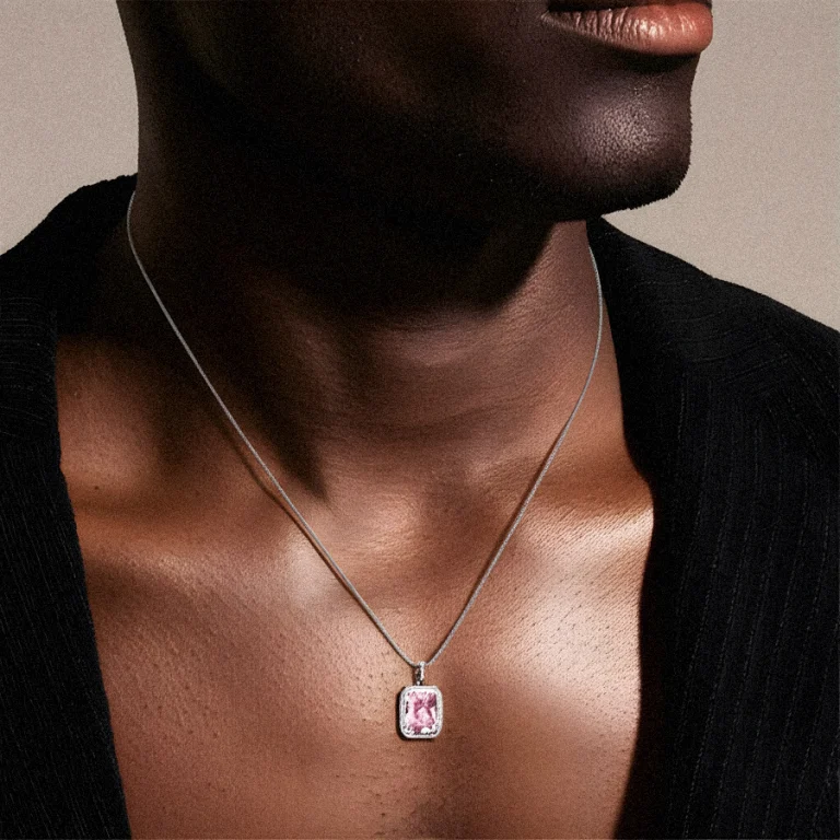 $89.00The Diamond Caibao Pendant features a rectangular pink zircon, surrounded by diamonds for a luxurious and elegant look. Perfect for any occasion, with a clavicle chain for a sleek finish.