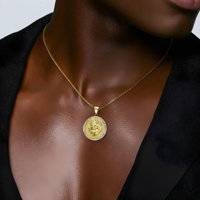 $89.00The Hip-Hop Punk Lion Head Medallion Pendant Necklace features a gold-plated, zircon-encrusted lion head design on a round medallion. Made from titanium stainless steel, it’s a bold, durable, and stylish piece for those who love statement jewelry.