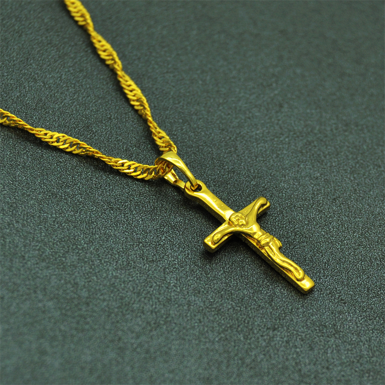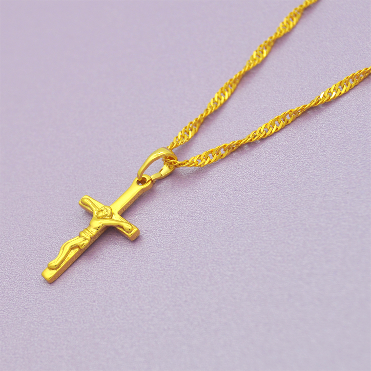 The 24K Gold Vermeil Crucifix Pendant features a sterling silver base with a luxurious 24K gold finish, offering a timeless religious symbol with a sleek, modern appeal.
