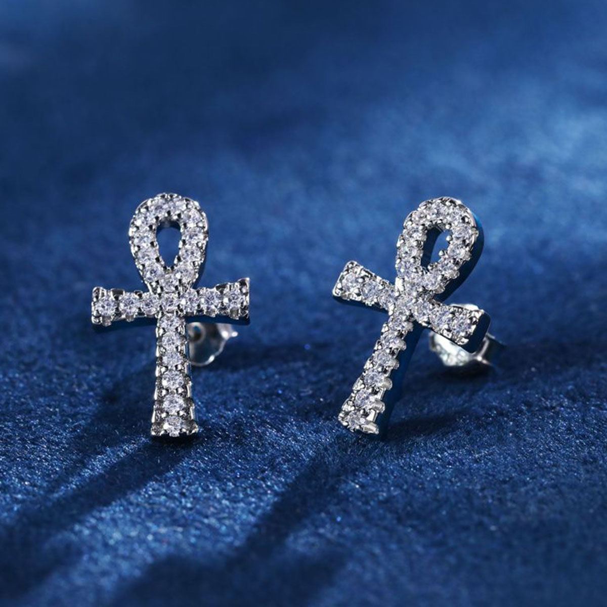 Full diamond Ankh cross earrings with minimalist zircon accents, designed for both men and women.
