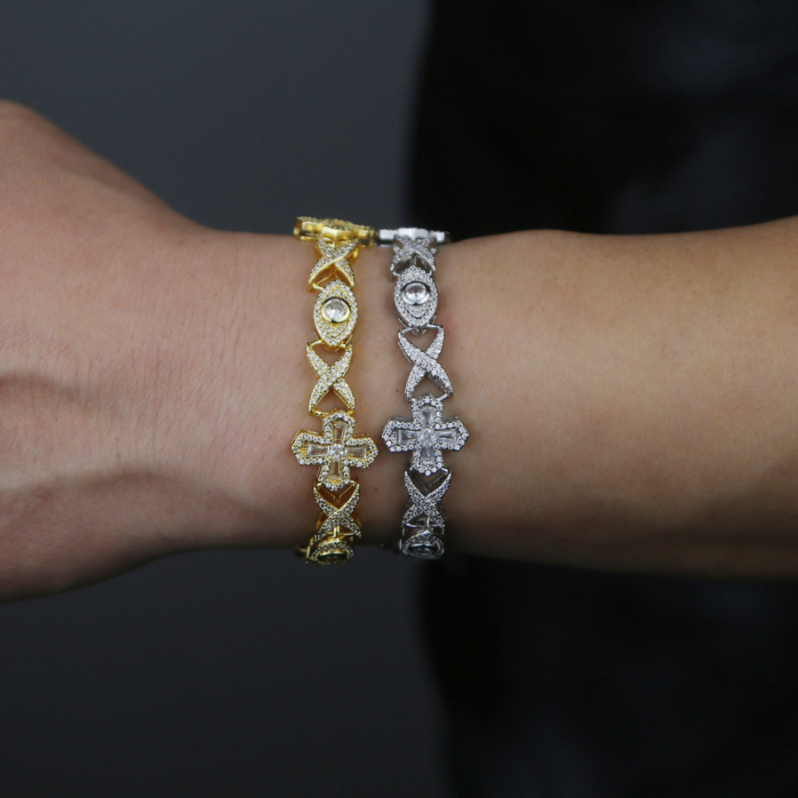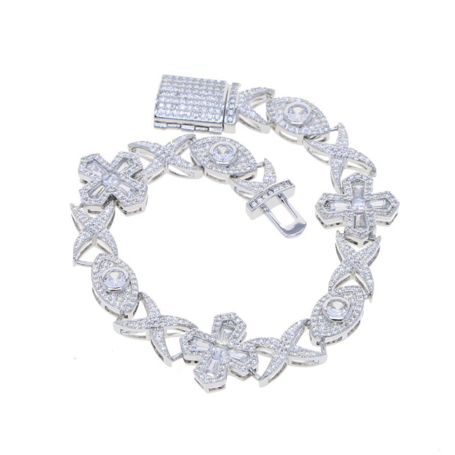 The Cross & Eye Knot Zircon Bracelet blends symbolism with hip-hop style, featuring eye and cross motifs encrusted with zircon stones. A bold, unisex statement piece perfect for fashion-forward individuals.