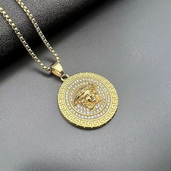The Diamond Medusa Pendant in Yellow Gold showcases an iconic Medusa head design, adorned with brilliant diamonds for a striking look. Crafted with high-quality gold plating, this piece embodies power and luxury.