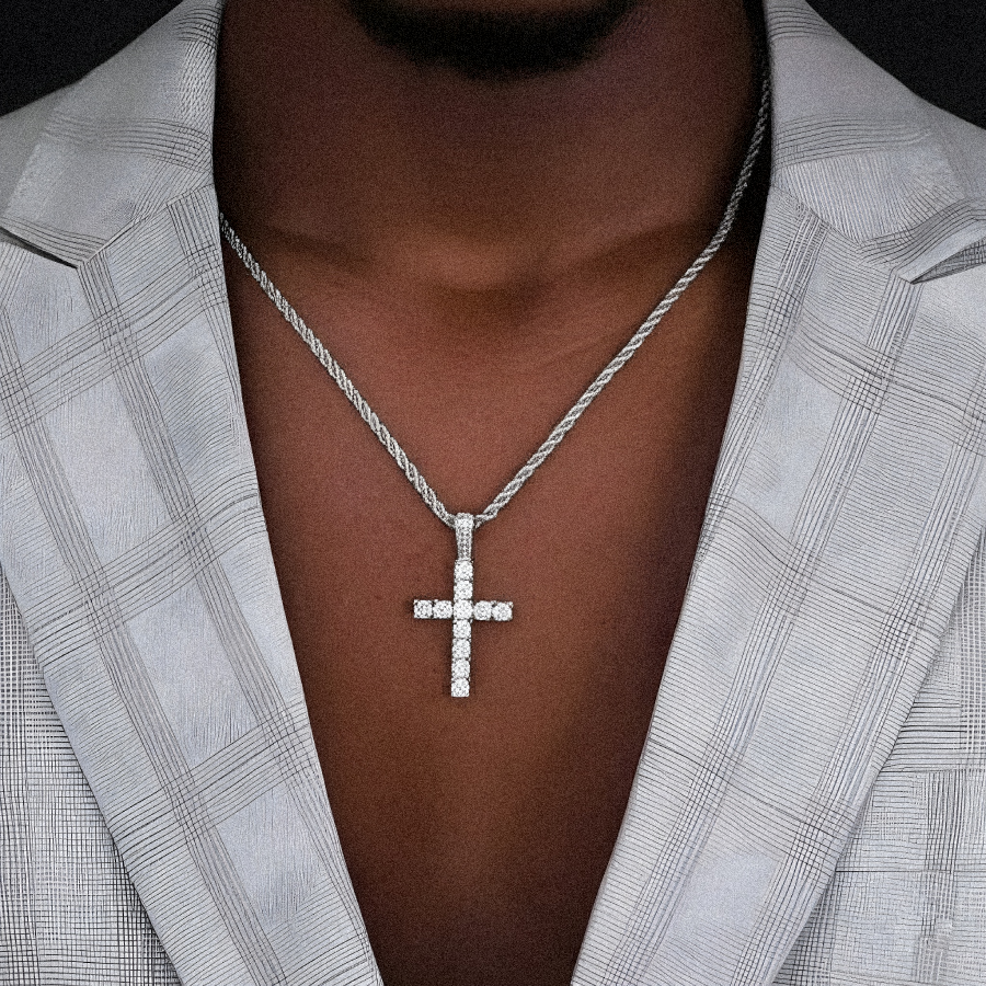 The Diamond Micro Cross Clip-On Pendant in White Gold is a statement piece designed for those who want to add a touch of elegance and edge to their hip-hop style. This pendant is meticulously crafted with micro pave cubic zirconia stones that offer a dazzling icy effect, while the white gold plating ensures a sleek, high-end look. The clip-on design makes it easy to attach to your favorite chain, allowing for versatility and comfort. Whether you’re looking to elevate your streetwear or add a bold piece to your collection, this pendant embodies both luxury and attitude.