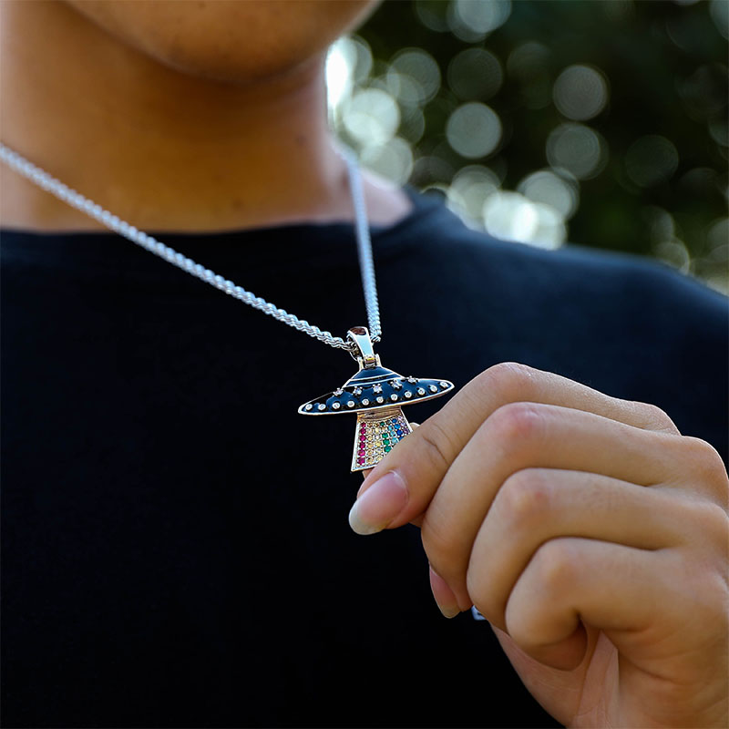 Make a cosmic statement with the D&Z Colorful Cubic Zirconia UFO Pendant Necklace. Iced-out with vibrant stones, this futuristic hip-hop accessory is perfect for men seeking bold, standout jewelry.