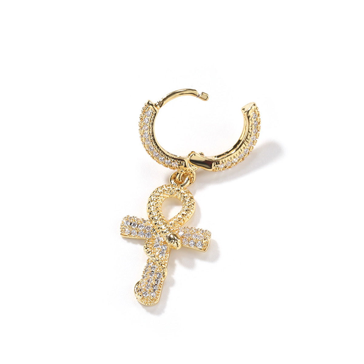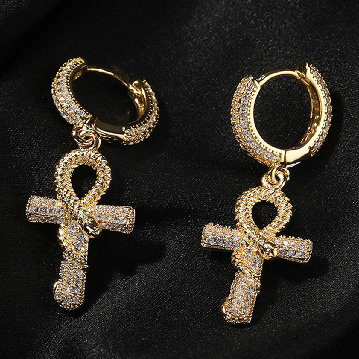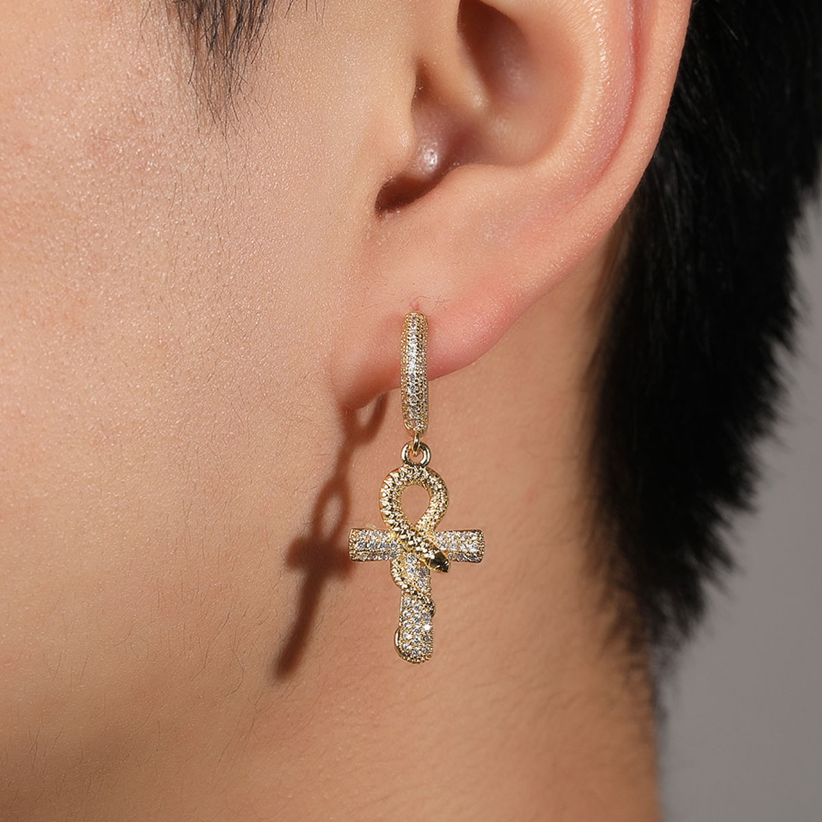 These high-end earrings feature an intricate Ankh and snake design with sparkling zircon stones, perfect for adding a touch of luxury and elegance to any outfit.