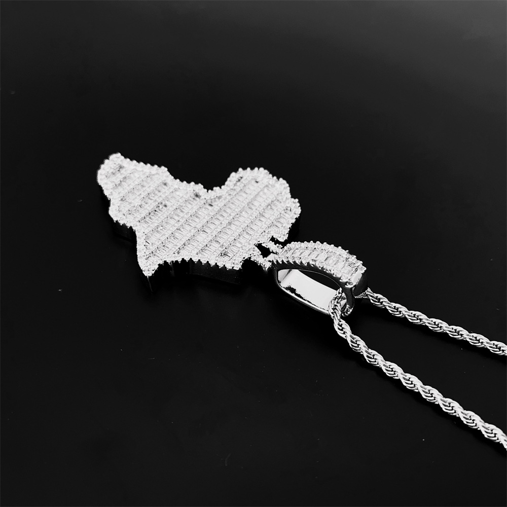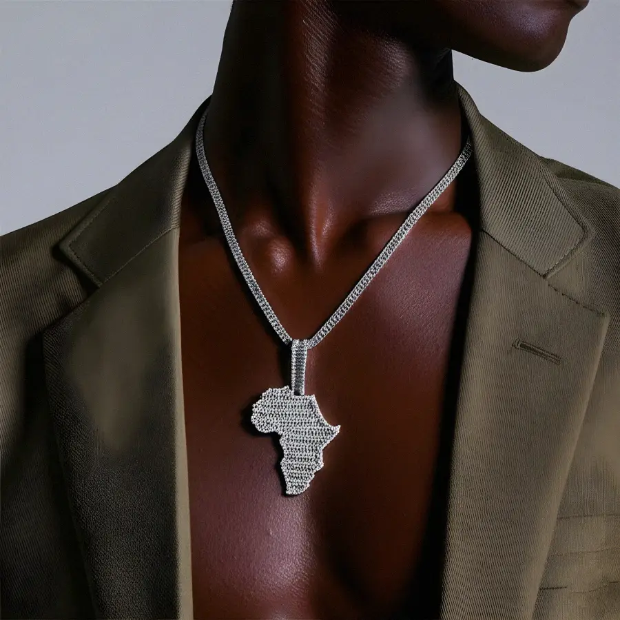 The Iced Baguette Africa Pendant in White Gold is a bold statement piece that celebrates heritage, culture, and style. Designed in the shape of the African continent, this pendant is fully encrusted with baguette-cut and round diamonds, creating a radiant, high-shine effect. Crafted with premium white gold plating, it offers both durability and luxury, making it a perfect accessory for both men and women. Whether paired with a Cuban, rope, or tennis chain, this pendant is an ideal addition to any hip-hop, streetwear, or fashion-forward jewelry collection.