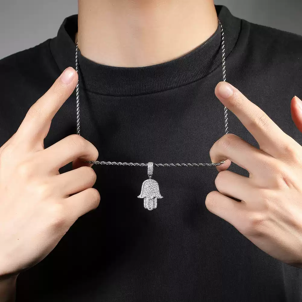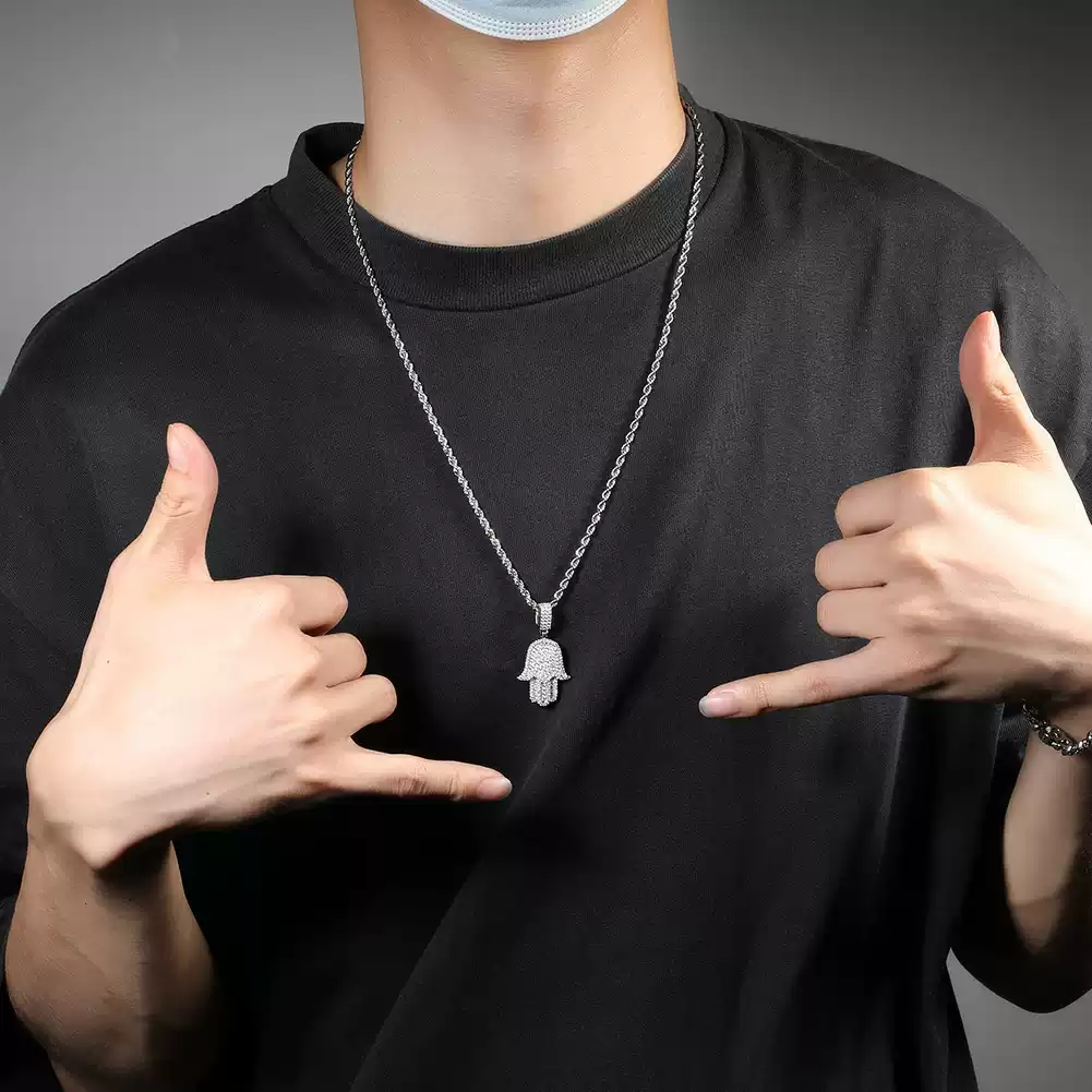 Embrace style and protection with the Hamsa Hand of Fatima Pendant Necklace, a symbol of luck, strength, and positivity. This gold-colored pendant is beautifully iced out with sparkling cubic zirconia stones, creating an eye-catching bling effect. Designed for both men and women, this hip-hop-inspired charm necklace blends spirituality with fashion, making it a perfect accessory for any outfit. Whether worn for its cultural significance or as a stylish statement piece, this necklace is a must-have addition to your jewelry collection.