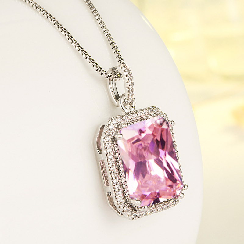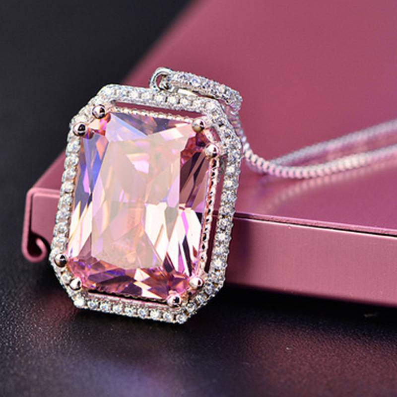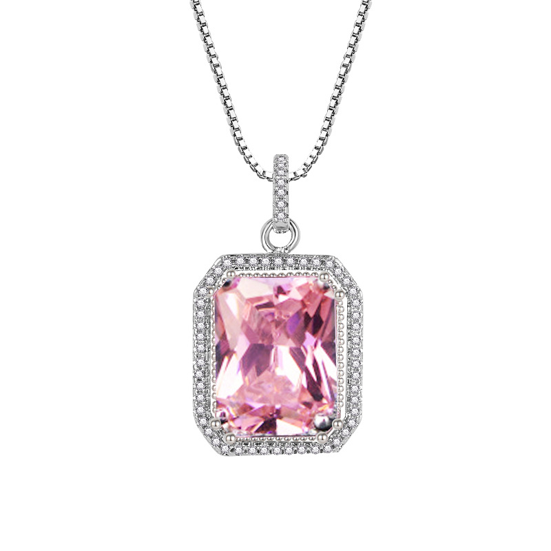 The Diamond Caibao Pendant features a rectangular pink zircon, surrounded by diamonds for a luxurious and elegant look. Perfect for any occasion, with a clavicle chain for a sleek finish.