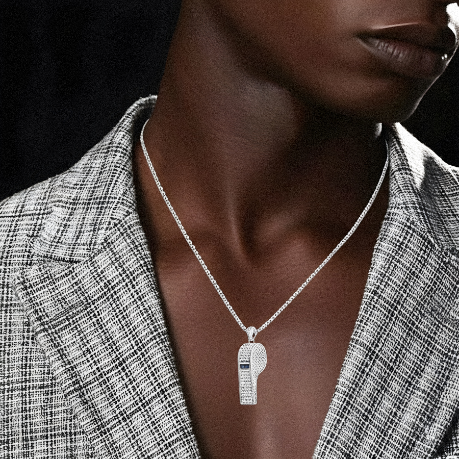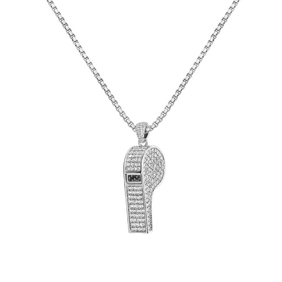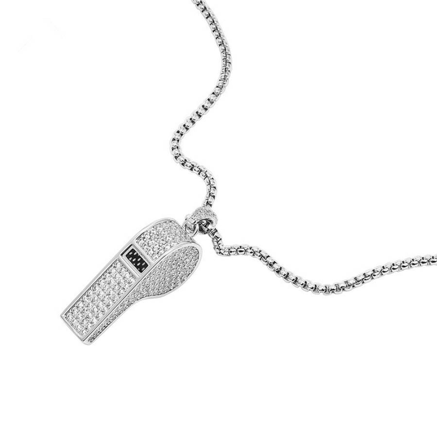Add a touch of street luxury with the Iced Large Whistle Pendant in White Gold. Fully encrusted with cubic zirconia stones, this statement piece combines style and shine for a look that speaks volumes. Perfect for any hip-hop enthusiast.