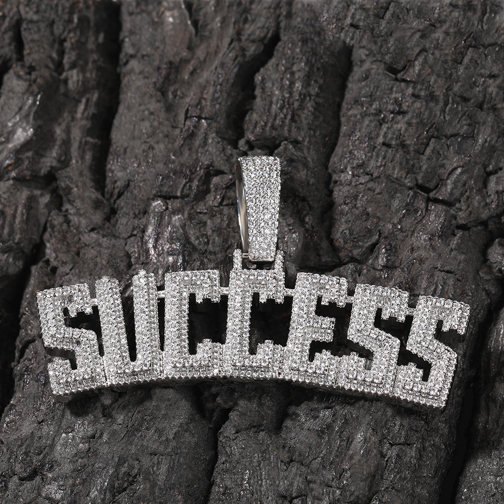 The Iced Success Letter Pendant in White Gold is a bold hip-hop jewelry piece, featuring shimmering CZ stones on “SUCCESS” lettering for an iced-out look. Perfect for making a statement.