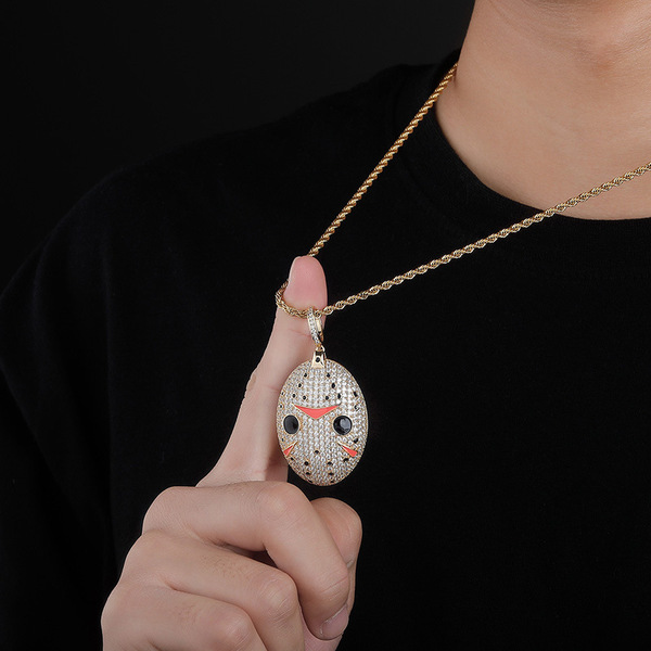 The Jason Mask Pendant in Yellow Gold is a bold hip-hop jewelry piece, featuring intricate detailing and shimmering CZ stones. A must-have for those who love statement accessories.