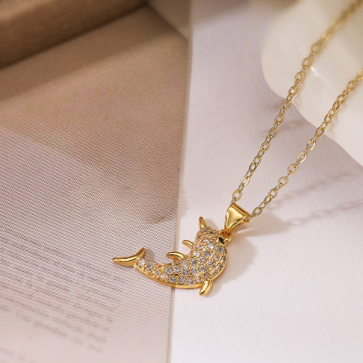 Add a touch of elegance to your jewelry collection with the Dolphin Pendant Necklace, a beautiful blend of luxury and charm. Crafted from premium copper and plated with real gold, this pendant features a detailed dolphin design encrusted with sparkling zircon stones for a dazzling shine. The delicate and dainty chain makes it perfect for layering or wearing solo, creating a sophisticated yet playful look. Ideal for women who appreciate cute, fine jewelry, this necklace is perfect for everyday wear or special occasions, adding a touch of whimsy and elegance to any outfit.