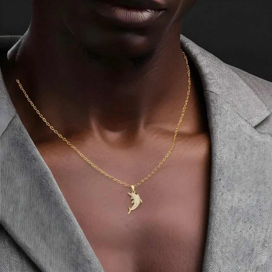 The Dolphin Pendant Necklace is a real gold-plated copper piece featuring a sparkling zircon-encrusted dolphin design. A cute and delicate accessory that adds charm and elegance to any outfit, perfect for women who love subtle, refined jewelry.