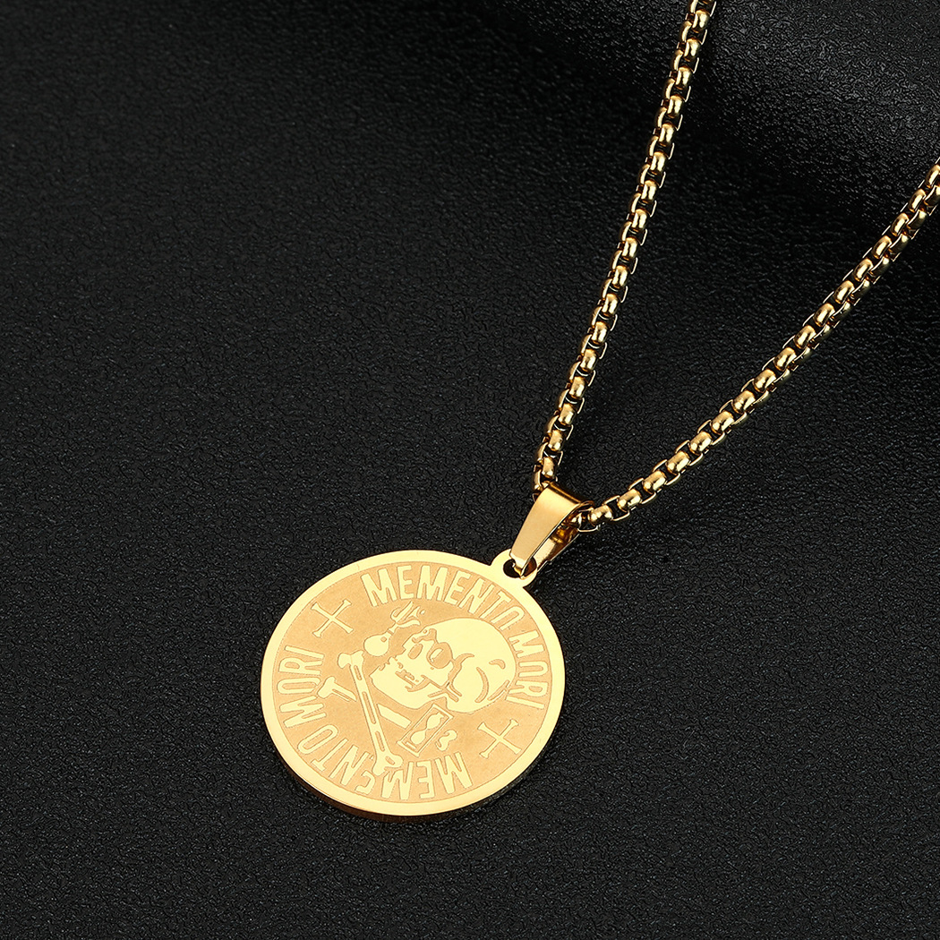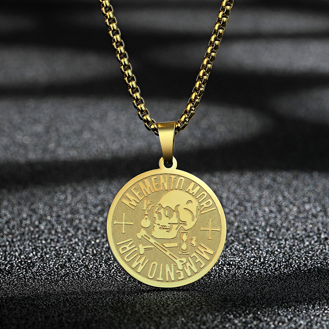 The Memento Mori Pendant in Gold is a symbolic and stylish piece featuring intricate skull detailing, representing wisdom and the fleeting nature of life. A bold addition to any hip-hop jewelry collection.
