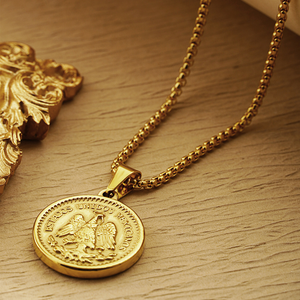 Level up your style with this gold Mexican Eagle coin pendant. Bold, historic, and straight-up hip-hop vibes.