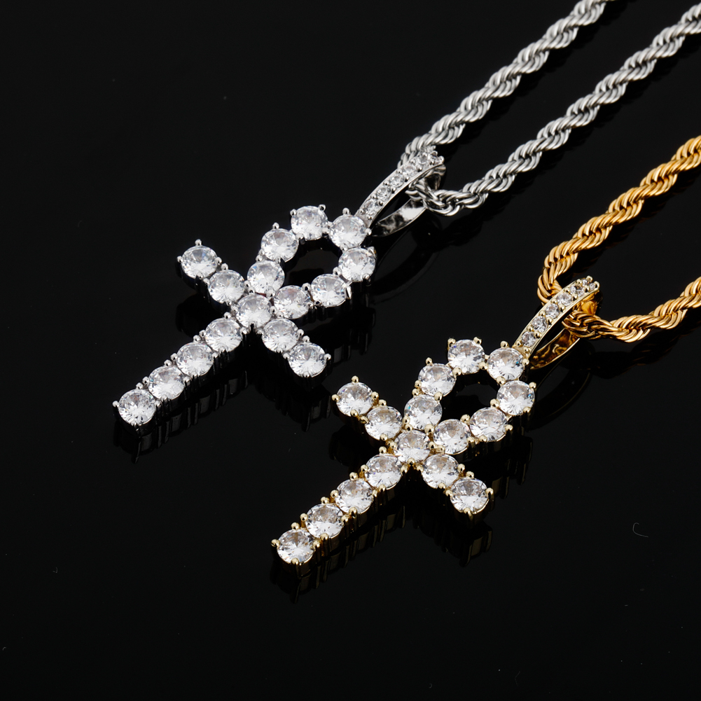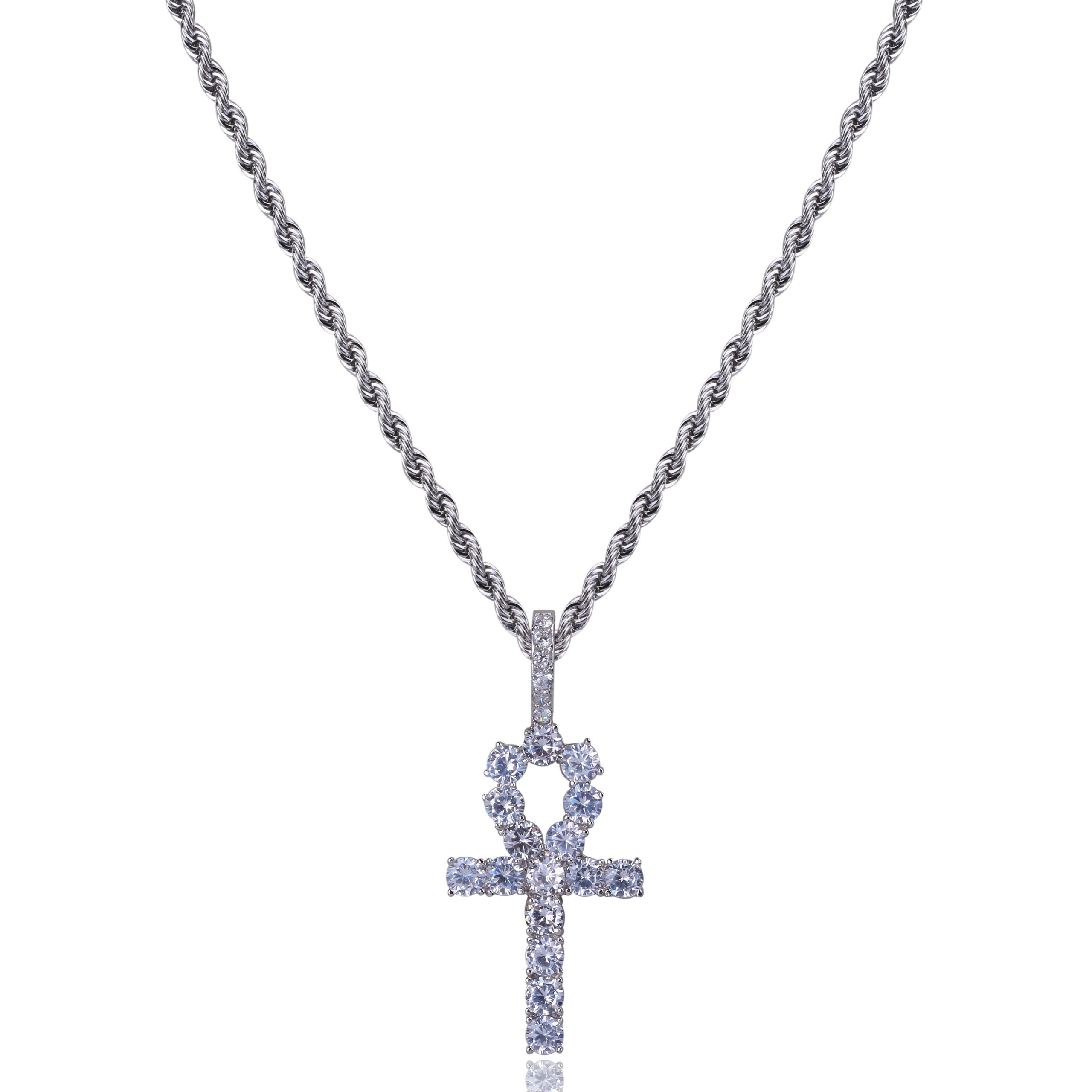 Elevate your style with the Micro Ankh Cross Clip-On Pendant in White Gold. Featuring iced cubic zirconia stones and a clip-on design, this pendant fuses ancient symbolism with modern fashion, perfect for hip-hop enthusiasts.