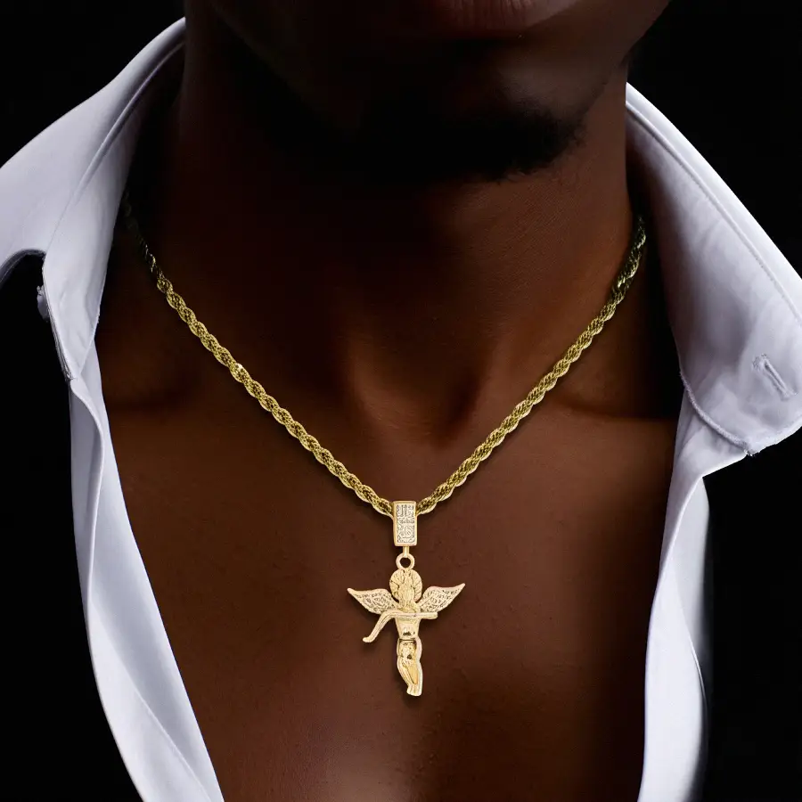 The Micro Iced Cupid Pendant in Yellow Gold is a striking symbol of love and luxury. Crafted with precision, this hip-hop inspired pendant features a finely detailed Cupid design, fully encrusted with brilliant stones for an eye-catching sparkle. The yellow gold finish enhances its bold and stylish appeal, making it a standout piece for any jewelry collection. Whether worn alone or paired with other chains, this pendant adds a touch of romance and opulence to any outfit.