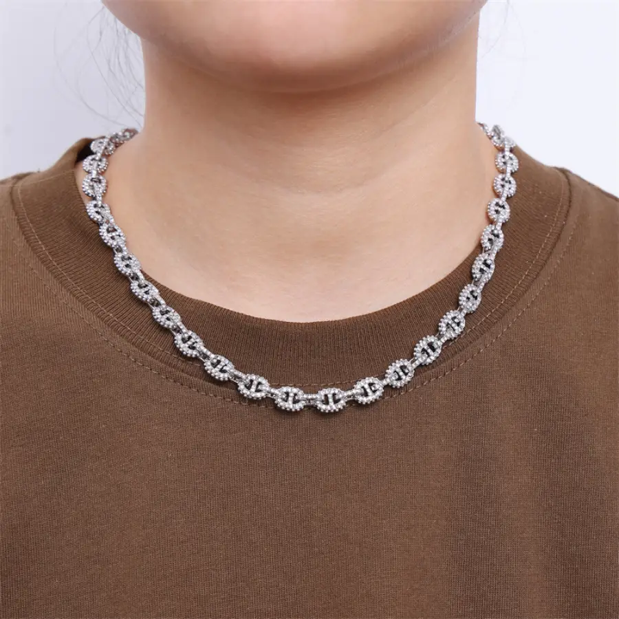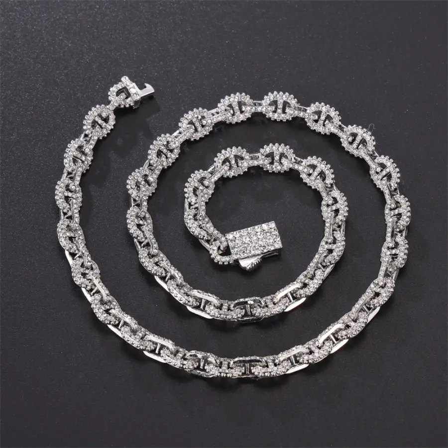 Make a statement with the 8mm Iced-Out Pig Nose Cuban Link Chain, a bold fusion of hip-hop edge and luxury fashion. Featuring the unique pig nose Cuban link design, this necklace is fully encrusted with sparkling diamonds, ensuring maximum shine and impact. Crafted from high-quality alloy, it offers durability while maintaining a trendy, punk-inspired aesthetic. Designed for both men and women, this eye-catching piece is perfect for those who love streetwear, hip-hop fashion, and standout accessories. Whether worn solo or layered, this necklace adds the perfect touch of urban style and attitude.