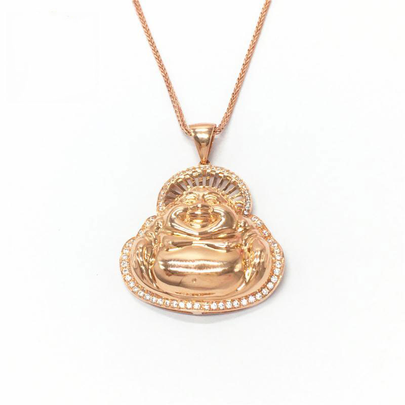 Embrace serenity and spiritual elegance with the 14K Rose Gold Plated Buddha Pendant. This beautifully crafted pendant features a detailed Buddha design, symbolizing peace, wisdom, and enlightenment. Plated in luxurious 14K rose gold, it exudes a warm, radiant glow while ensuring long-lasting durability. The intricate craftsmanship and polished finish make it a standout piece, perfect for both men and women who appreciate spiritual and stylish jewelry. Whether worn on a Cuban, rope, or tennis chain, this pendant is ideal for those who love hip-hop, streetwear, or meaningful statement accessories.