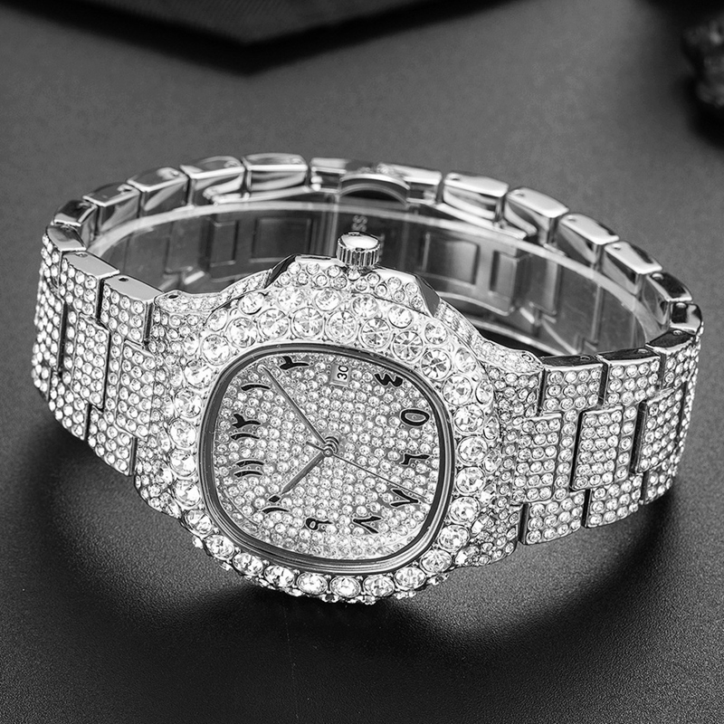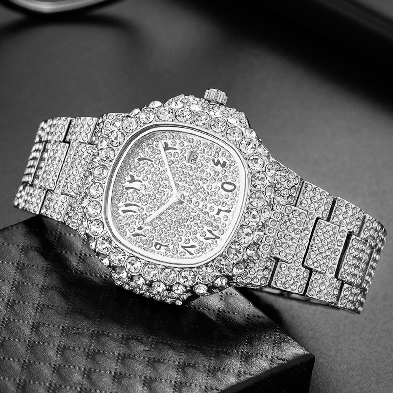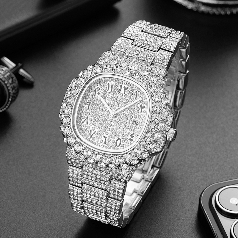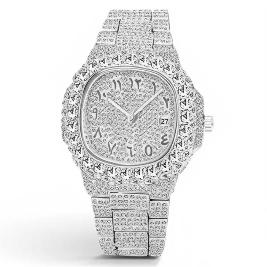 The UNTD Square Full Diamond Iced-Out Arabic Dial White Gold Men’s Watch offers an exceptional blend of extravagant design and cultural influence. Its fully diamond-encrusted square case delivers maximum shine, while the Arabic numeral dial adds a distinctive and refined detail. Powered by reliable quartz movement, it ensures precision timekeeping without compromising on bold aesthetics. Perfect for special events, nightlife, or everyday luxury wear, this UNTD watch is built for individuals who appreciate standout pieces with symbolic meaning. Whether you’re elevating a streetwear look or pairing it with formal fashion, this iced-out Arabic dial timepiece makes a powerful statement.