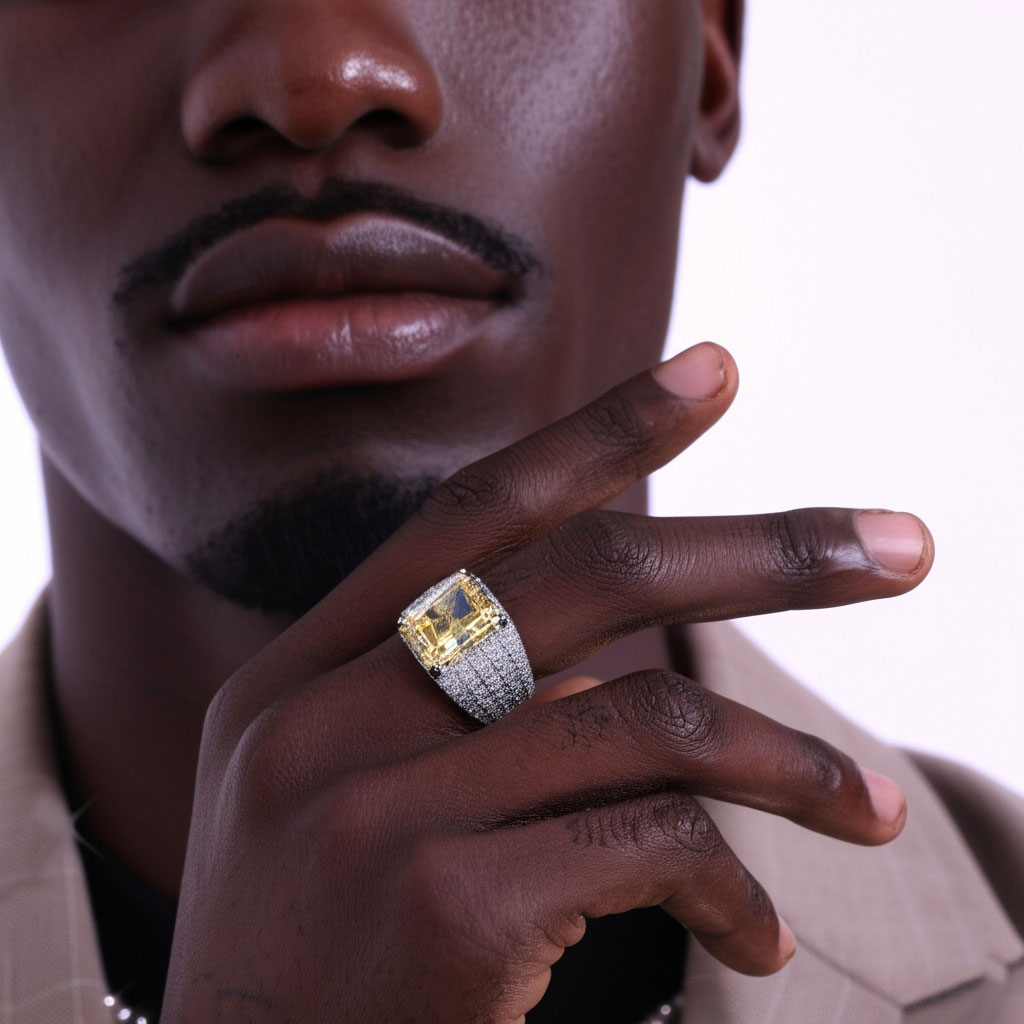 A minimalist and stylish men’s ring featuring a high-carbon diamond and goose yellow zircon for a unique look.